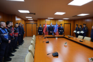 Punonjësit e Forcës së Posaçme “Shqiponja” të DVP Shkodër, Inspektor Samet Qotaj, Inspektor Arlind Mehmeti, Inspektor Rigers Sekja dhe Inspektor Kristi Koçeku, si dhe punonjësit e Seksionit të Rendit Publik të Komisariatit të Policisë Shkodër, Inspektor Izmir Lamkollari dhe Inspektor Xhuljo Hafëzi, u mirëpritën ditën e sotme, në ambientet e Drejtorisë së Përgjithshme të Policisë së Shtetit, ku Drejtor Proda iu dorëzoi certifikatat e akorduara me motivacionin “Për merita të veçanta, për profesionalizmin dhe përkushtimin e treguar në përmbushjen cilësore të detyrave, dhe kontributin e dhënë gjatë viteve të punës, në shërbim të Policisë së Shtetit”.