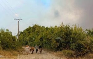 Diku dallohet edhe një familje që po largohet mes flakëve me gjithçka që ka patur. Ata kanë marrë me vete edhe lopën dhe viçin. Kjo familje ishte larguar nga shtëpia e tyre e “pushtuar” nga flakët para dy orësh prej njërit nga fshatrat e përfshirë nga zjarret shkatërruese në Gramsh. Të gjithë si një i vetëm, e tërë familja, të kapur përdore teksa largohet nga rreziku i flakëve, kanë marrë me vete jo vetëm fëmijët, por edhe lopën dhe viçin, pasurinë e tyre të vetme. Kjo pamje prekëse flet më shumë se çdo fjalë. Është një përpjekje e dëshpëruar për të shpëtuar jetën dhe gjithçka që simbolizon mbijetesën në jetën e fshatrave të Gramshit që tashmë po shkrumbohen plotësisht.