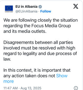Ne po ndjekim nga afër situatën lidhur me Focus Media Group dhe mediat e saj. Mosmarrëveshjet midis të gjitha palëve të përfshira duhet të zgjidhen duke respektuar plotësisht ligjshmërinë dhe procedurat e rregullta ligjore. Në këtë kontekst, është e rëndësishme që çdo veprim i ndërmarrë të mos cenojë mundësinë e gazetarëve për të ushtruar lirinë e tyre në përcjelljen e informacionit dhe për të ruajtur konfidencialitetin e burimeve të tyre. Këto janë aspekte thelbësore të lirisë dhe pluralizmit të medias, që janë kritike për garantimin e shtetit të së drejtës.